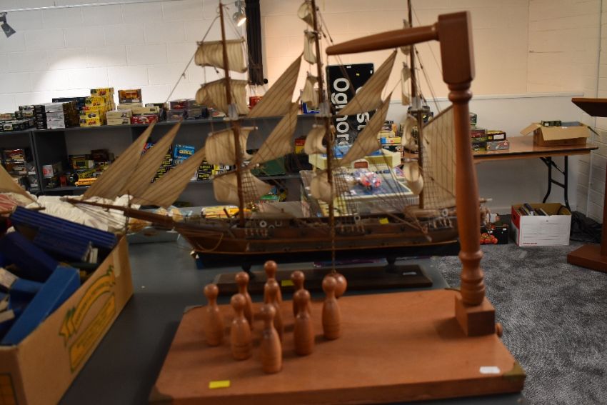 A House of Marbles Bar Skittles game, having nine skittles with string attached