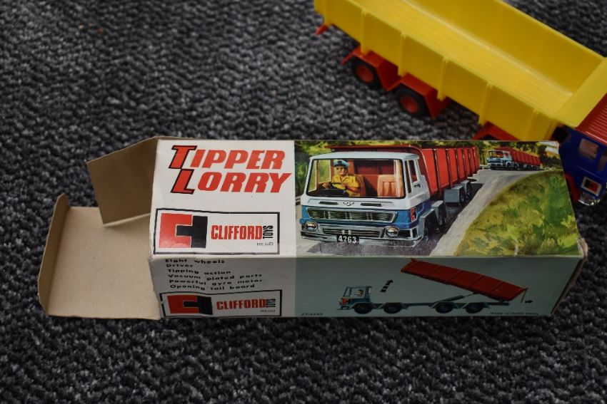 A Clifford Toys plastic Tipper Lorry, a Sutcliffe clockwork & tinplate Jupiter Ocean Pilot Cruiser Boat along with a Marx plastic remote controlled tank, all in original boxes