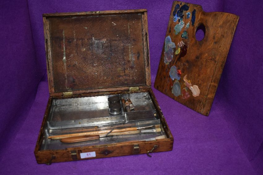 A portable oak cased artist paint and brush set including oak artist palette by Winsor and Newton