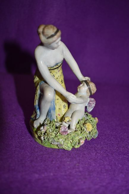 A 19th century antique Staffordshire ceramic figure base of maiden and angry cherub