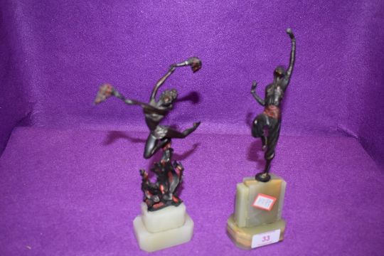 Two art deco styled figures, cast and set on agate base in a Franz Iffland design