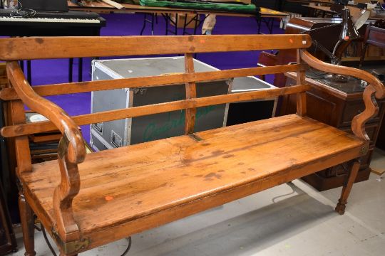 A large hardwood bench with brass and iron fixings , of Indian origin, quite possibly from railways, approx. dimensions length 197cm, depth 58cm height to seat 53cm, to back 107cm