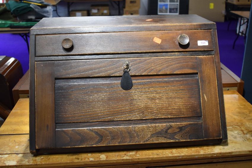 A mid Century dark to mid stain Ercol style table top desk, approx. width 64cm