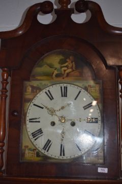 A 19th Century oak and mahogany long case clock, having 8 day movement, with painted arch dial, dual subsidiary dials, marquetry work case
