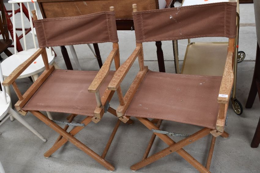 A pair of folding canvas directors style chairs, probably teak frames, could so with a good oil (see next lot!)