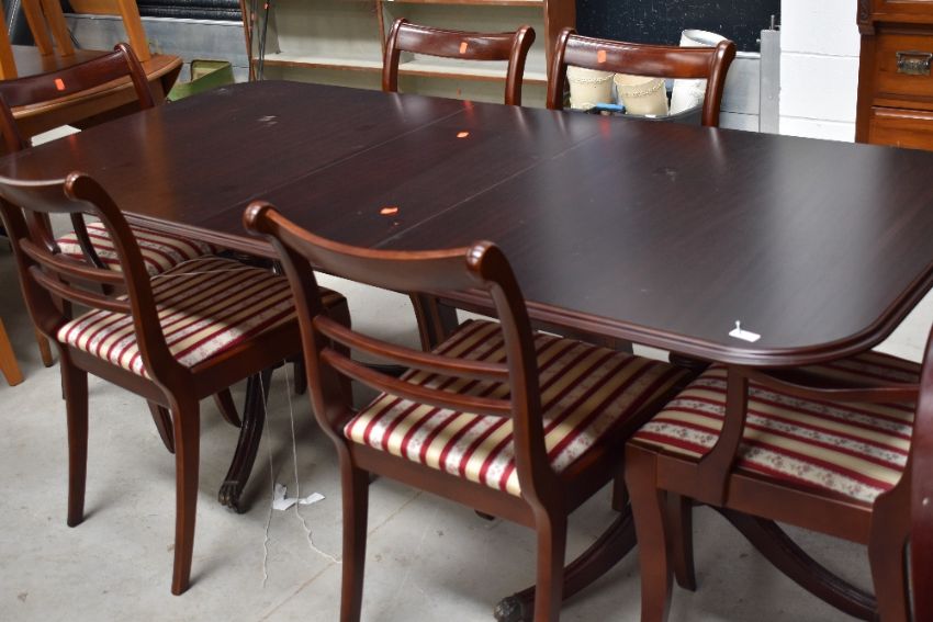 A reproduction Regency style mahogany extending dining table and set of six (four plus two) similar dining chairs, open length approx. 198cm