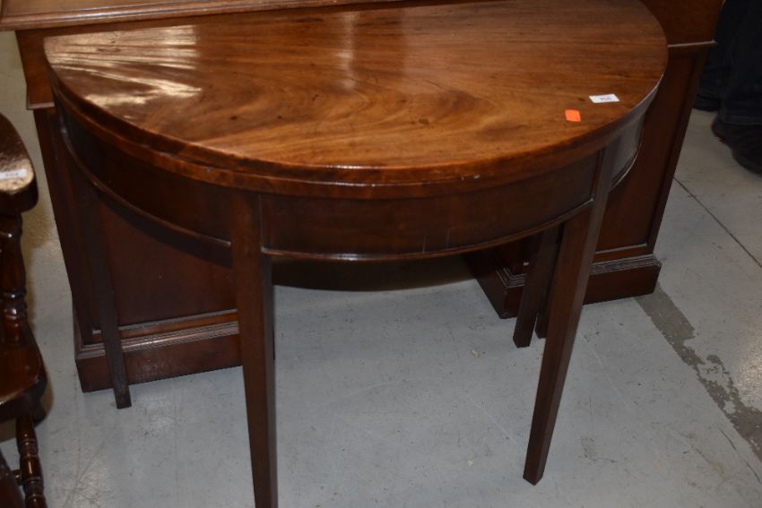 A 19th Century mahogany demi lune fold over table, approx width 91cm, open diameter 89cm , some light staining and slight lift to veneer top , joints on back leg loose