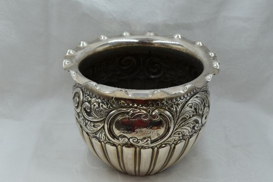An Edwardian silver jardiniere having gadrooned decoration with repousse rose and scroll band, engraved cartouche and frilled rim, Chester, Jay, Richard Attenborough & Co, approx 606g