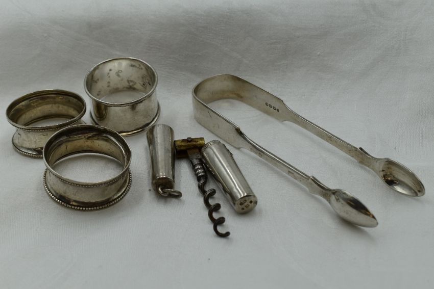 A small selection of HM silver including Victorian sugar nips, three napkin rings and travel corkscrew