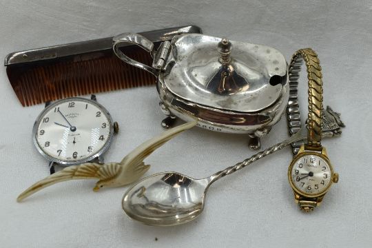 A small selection of HM silver including lidded mustard, comb, spoon, Rotary watch face, brooch etc