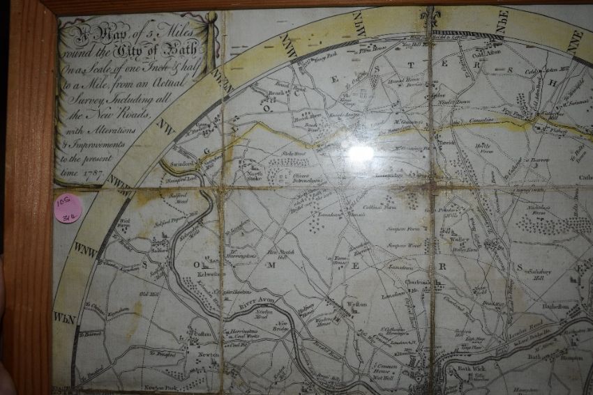 A late 18th Century Map of the City of Bath and Environs. Dated 1787. In 16 folding sections, linen backed, framed and glazed. Measures: approx 45cm x 45cm. (1)