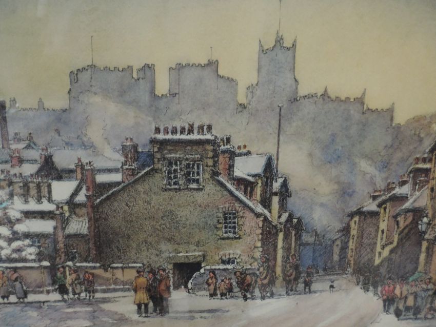 A watercolour, F Hodgson, winter townscape, Lancaster, signed, framed and glazed, 25 x 34cm