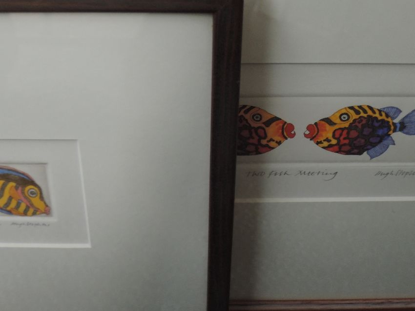 Two Ltd Ed prints, after Hugh Stephens, Fish, numbered 17/50, signed, framed and glazed, 6 x 7cm, and Two Fish Meeting, numbered 22/75, signed, framed and glazed, 7 x 19cm