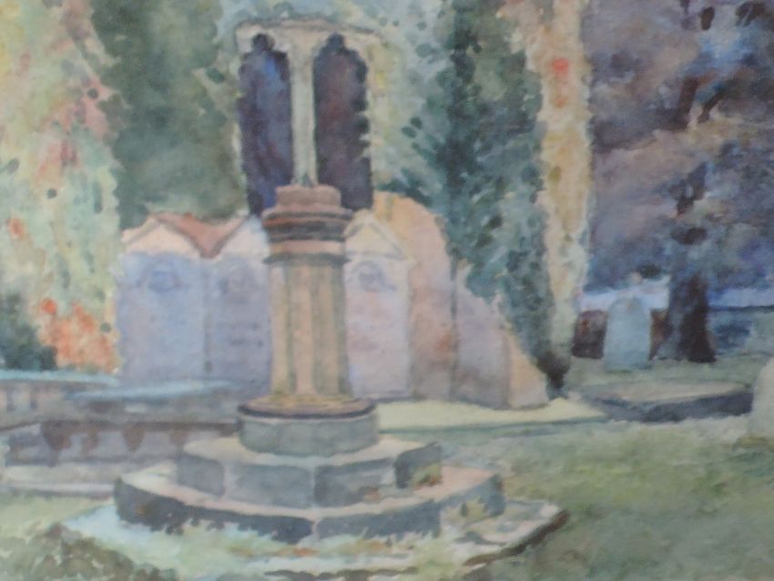 A watercolour, A Wolfenden, church yard, signed, framed and glazed, 23 x 31cm, and a similar watercolour, market cross, signed, framed and glazed, 31 x 22cm