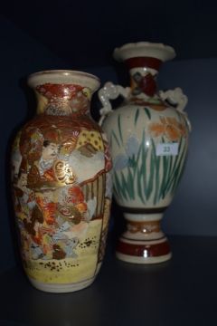 Two Japanese vase one having twin handle design and similar highly decorated with Samurai