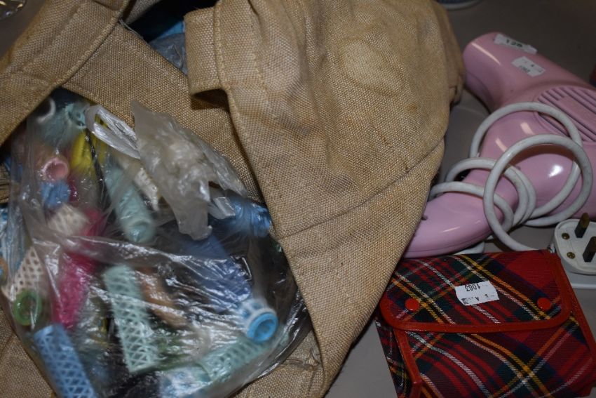A bag containing a vintage Pifco hairdryer, and various other hairdressing equipment.