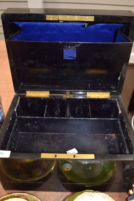 A Victorian ebonised mahogany writing box,having brass edging detail, concealed draw to bottom and internal compartments lined in royal blue fabric 'Jenner and Knewstue,Manufacturers to the Queen,33 ST.James street and 66 Jermyn ST. London'.