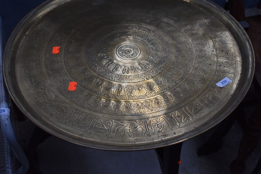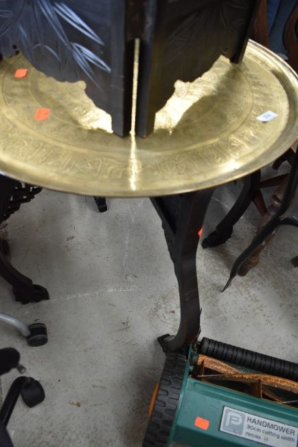 An Oriental or Islamic brass tray top table, having dark fretwork frame