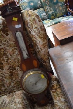 An Edwardian mahogany banjo aneroid barometer, having line and shell inlay decoration , broken thermometer scale, approx. length 80cm