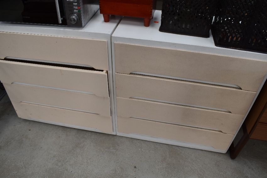 A pair of vintage painted ply chests of four drawers, each width approx. 76cm, depth 40cm, height 76cm