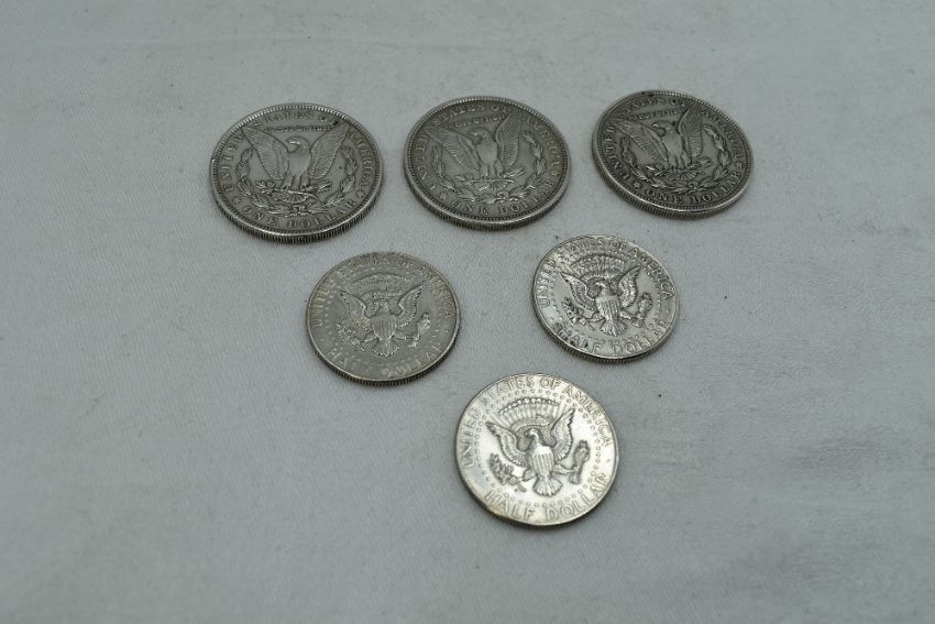 Six USA Coins, 3 Dollars 1921 x2 and 1889, 3 Half Dollars 1964 x3