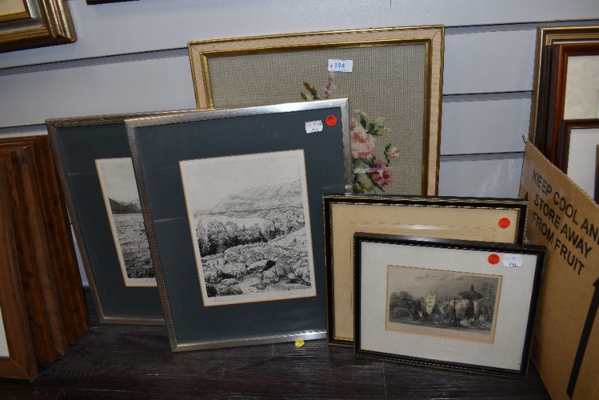 Two framed limited edition prints of pencil sketches, one of Crummock Water, 2/8, the other Ashness bridge,2/78 both indistinctly signed but appear to read Trevor c Haines. also included are two hand tinted lithographic prints, both of Westmorland and a floral tapestry.