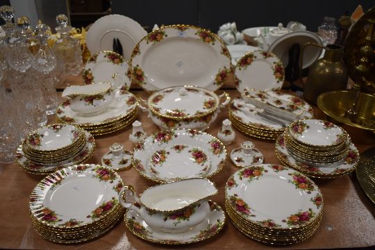 A large quantity of Royal Albert 'old country roses' dinner service, including Tureens,plates,cruet, platters and more, having transfer rose pattern and gilt edge detailing.