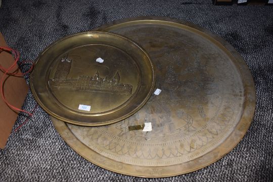 A large vintage brass Eastern styled table top and an embossed platter, possibly London scene.
