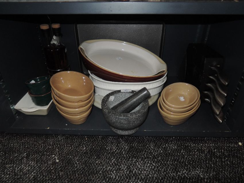 A selection of baking cooking and kitchenalia including granite mortar and pestle