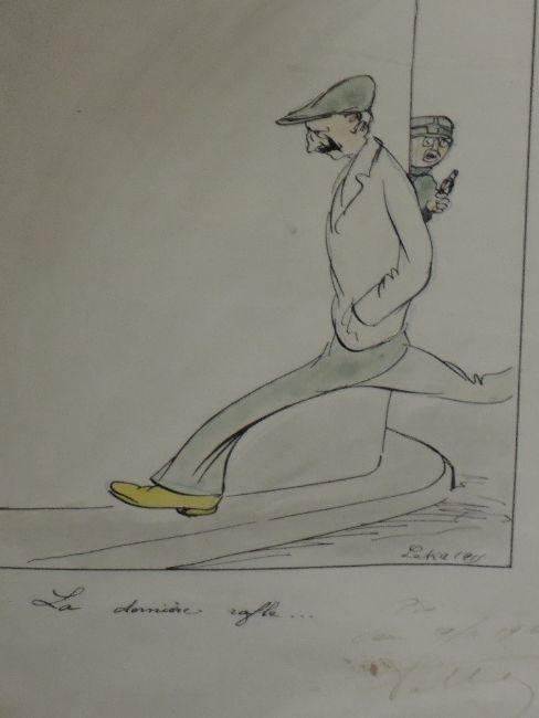 A coloured pen and ink sketch, Harry De Leka, La Dernier Rafle (The Last Round Up), French cartoon, with German censor approval , signed, and dated 29th February 1916, and marked Vise (seen) which allowed the sketch to be published in the newspaper. 44 x 30cm, framed and glazed