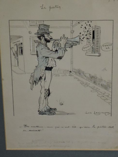 A coloured pen and ink sketch, Luc Leover, Le Piston, French cartoon, early 20th century, with annotated scripts and alternatives, Des Menteuis, signed, 36 x 24cm, framed and glazed