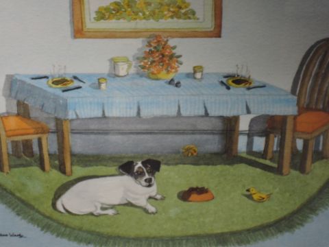 A watercolour, Barbara Wade, I Don't mind having the steak, dog interest, signed 18 x 23cm, framed and glazed