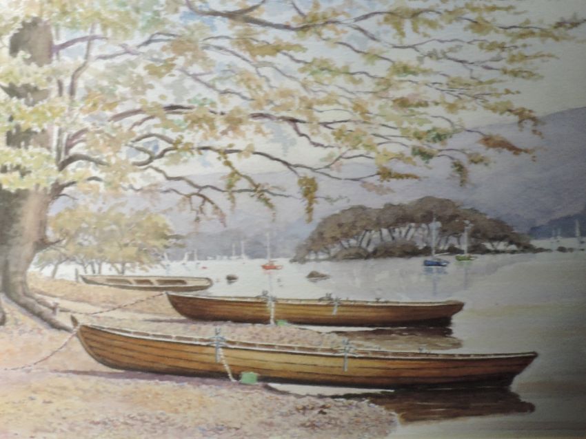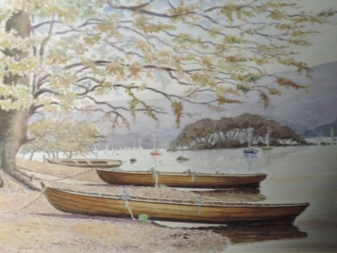 A watercolour, K Bate, Char boats, Bowness Bay, signed, 26 x 36cm, framed and glazed