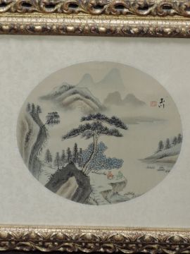 A picture on silk, Japanese landscape, dia 22cm, framed and glazed