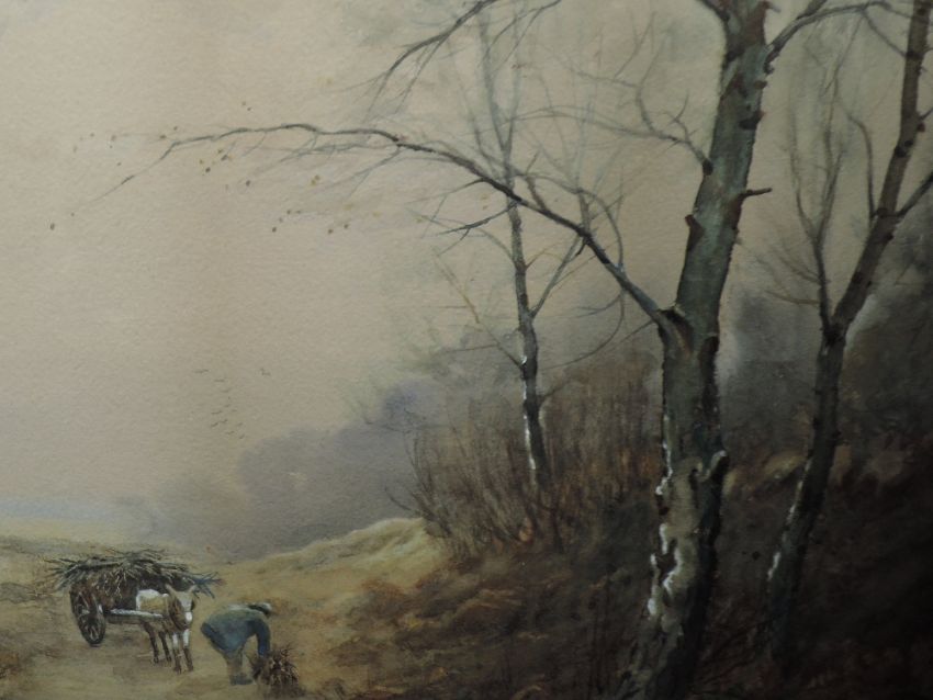 A watercolour, W H Muir, gathering faggots in woodland, signed, 34 x 49cm, framed and glazed