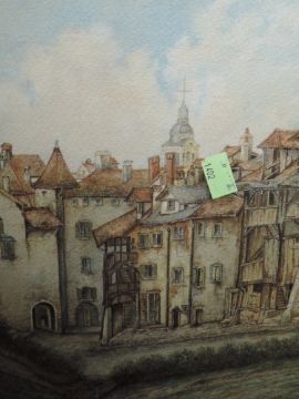 A watercolour, R H Atkin, St Martin Vembie, France, signed and attributed verso, 1936, 32 x 26cm, framed and glazed, a watercolour, continental townscape, 31 x 23cm, framed and glazed, and a watercolour, still life, 25 x 35cm, framed and glazed