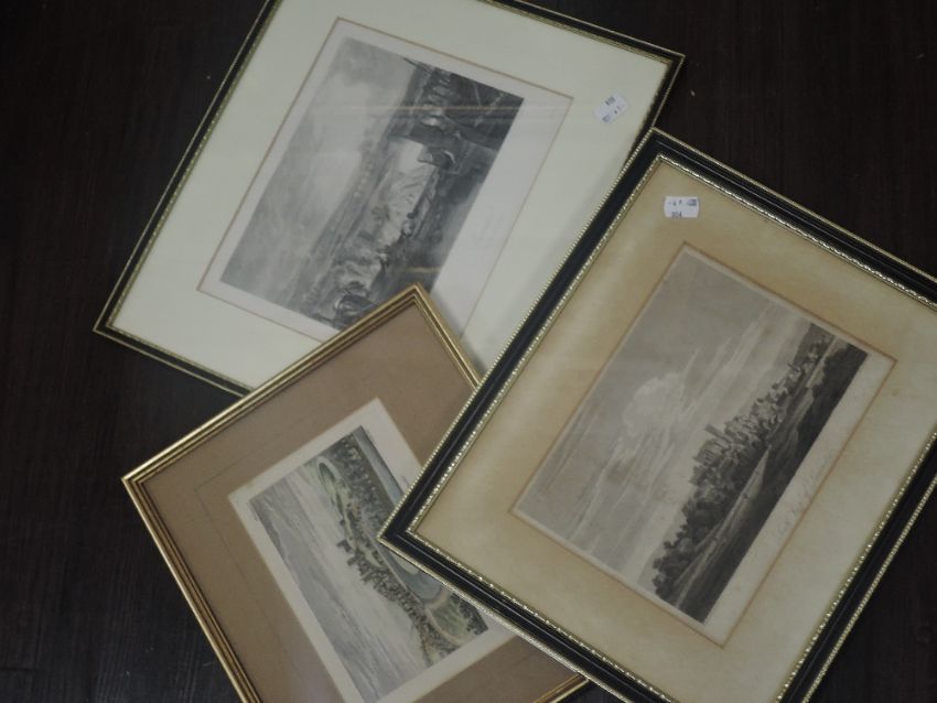 An engraving, Lancaster, C19th, 20 x25cm, an engraving, The North East View of Lancaster, 14 x 20cm, and an engraving South View of Lancaster, 17 x 23cm, all framed and glazed