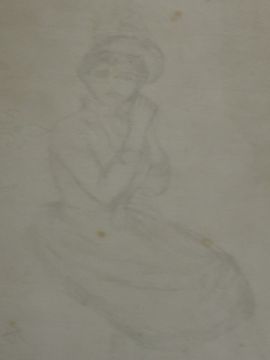 A pencil sketch, C R, lady in 18th century dress, monogrammed, 25 x 17cm, framed and glazed