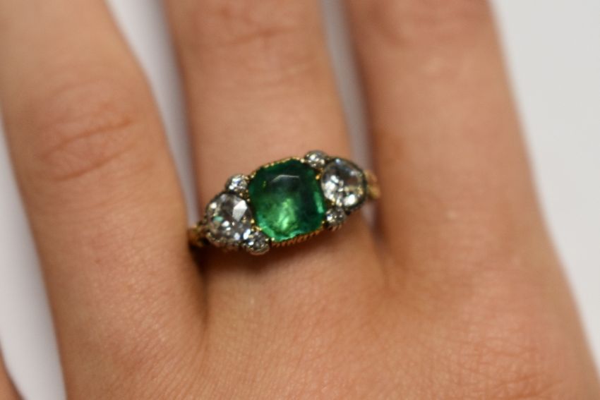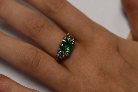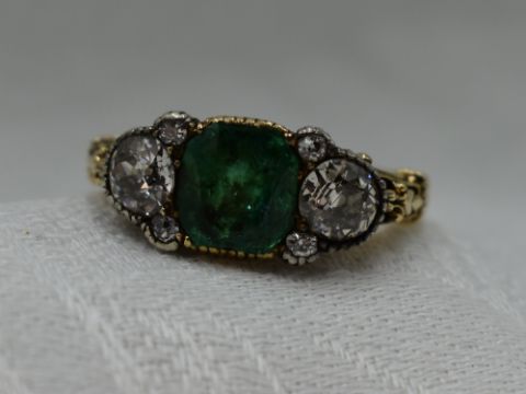 Condition Report no wear to emerald facetts, stone has marks within it but not black inclsusions. one diamond is clearer than the other but both bright and lively with no chips
