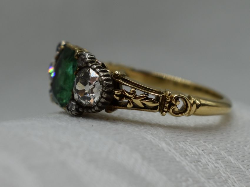 A lady's dress ring having a central emerald cut emerald, approx 1.4ct flanked by a trio of old cut diamonds to each shoulder, total approx 0.9ct in collared mounts with shaped solid back to emerald, raised pierced shoulders and a yellow metal loop, no marks, previously tested as 18ct gold, size N/O, with recent insurance valuation