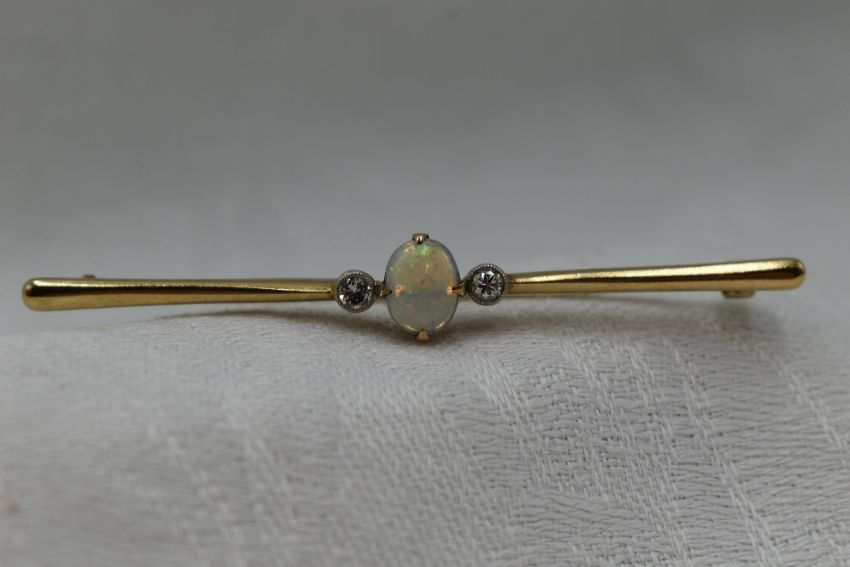 A 9ct gold bar brooch having a central opal flanked by two diamonds