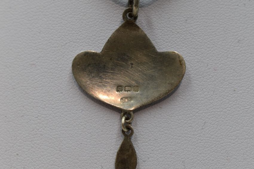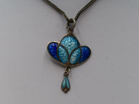 An Edwardian silver and enamel Art Nouveau pendant in shades of blue, Birmingham 1908, James Fenton on a white metal chain with barrel clasp