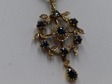 An Edwardian style 9ct gold pendant having central sapphire and diamond cluster in a diamond and sapphire wreath style border with a sapphire and diamond drop, on a 9ct gold box chain, approx 14'