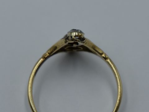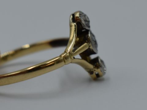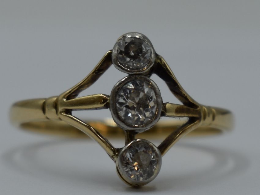 A lady's dress ring having a trio of diamonds, total approx 0.33ct in collared mounts on open triple shoulders on a yellow metal mount, marks worn, tests as gold, size O
