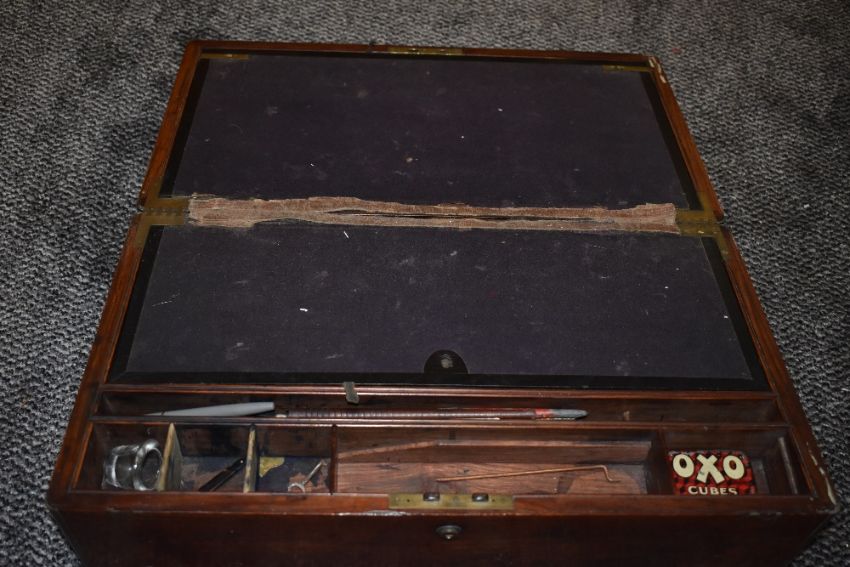 A part mahogany writing slope having brass inlaid details to sides and lid,handles folding flush to the sides, and segregated internal compartments.