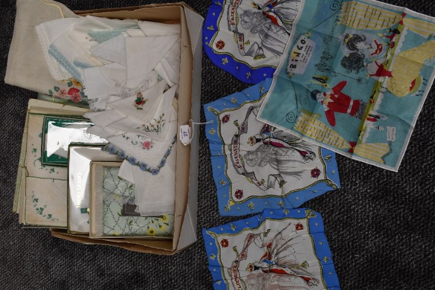 A variety of vintage handkerchiefs, pyjama cases and similar, some still in boxes.included are three beautifully bright crepe Queen Elizabeth souvenir handkerchiefs and one having advert for a Parisian company.