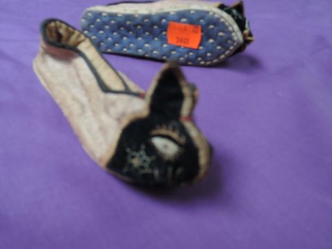 A pair of vintage children's slippers or shoes having oriental styling and rabbit faces to toes in velvet.