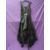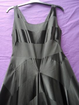 A black 1940s black striped gown(possibly a silk or synthetic silk blend) having handkerchief hem, darts and inserts to back and gathered detail to skirt finished with paste buckle. Very good condition, small to medium size.