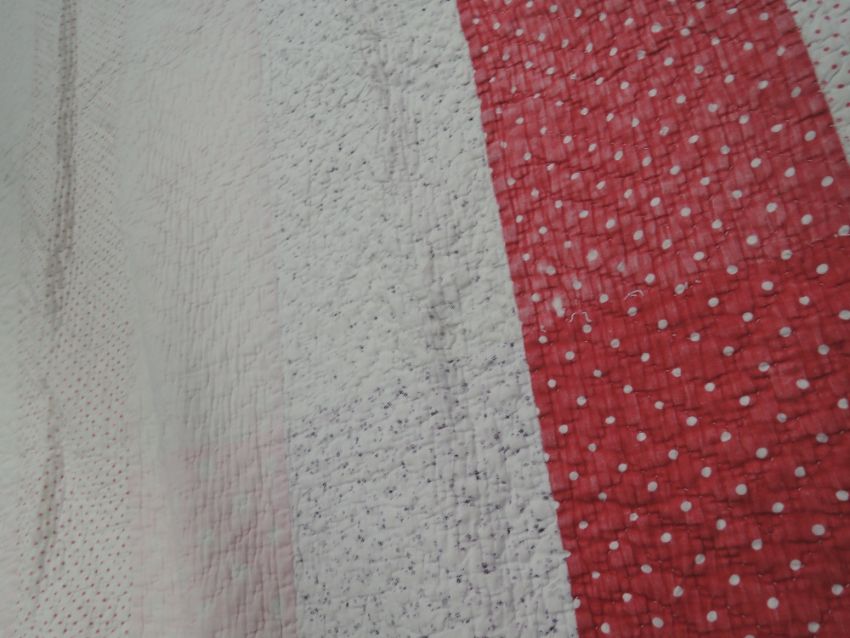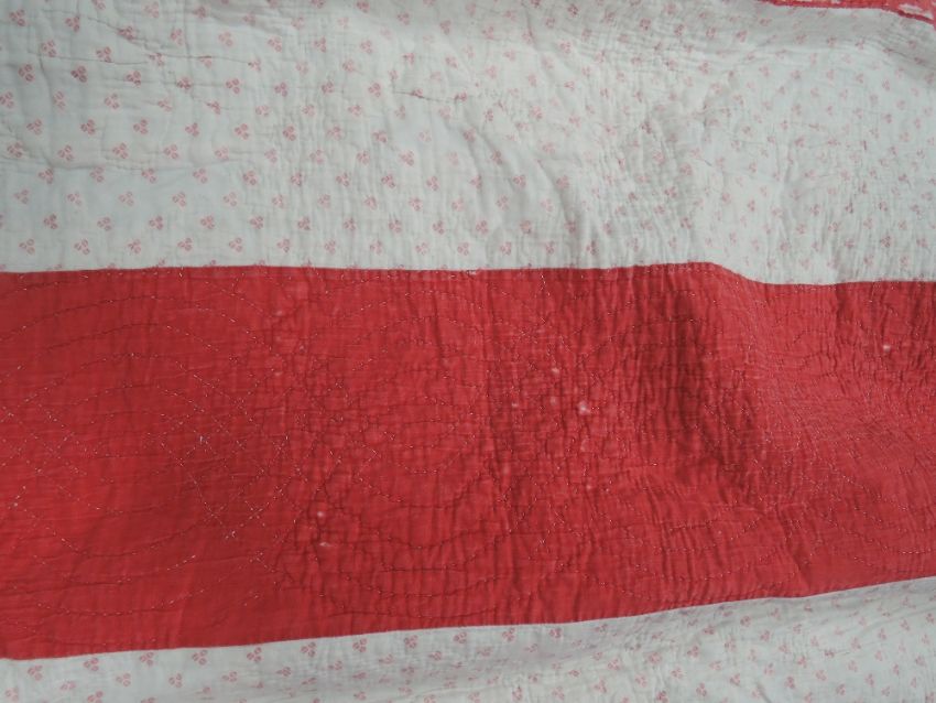Two large early 20th century quilts, both of cotton in red, pink and whites predominantly.wear throughout both.