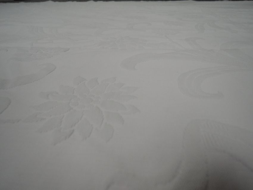 A large antique early 20th century Marseilles bed throw or coverlet, white on white with ornate sunflower or similar floral pattern and cross motif to edges, tightly woven and strong, in brilliant condition.